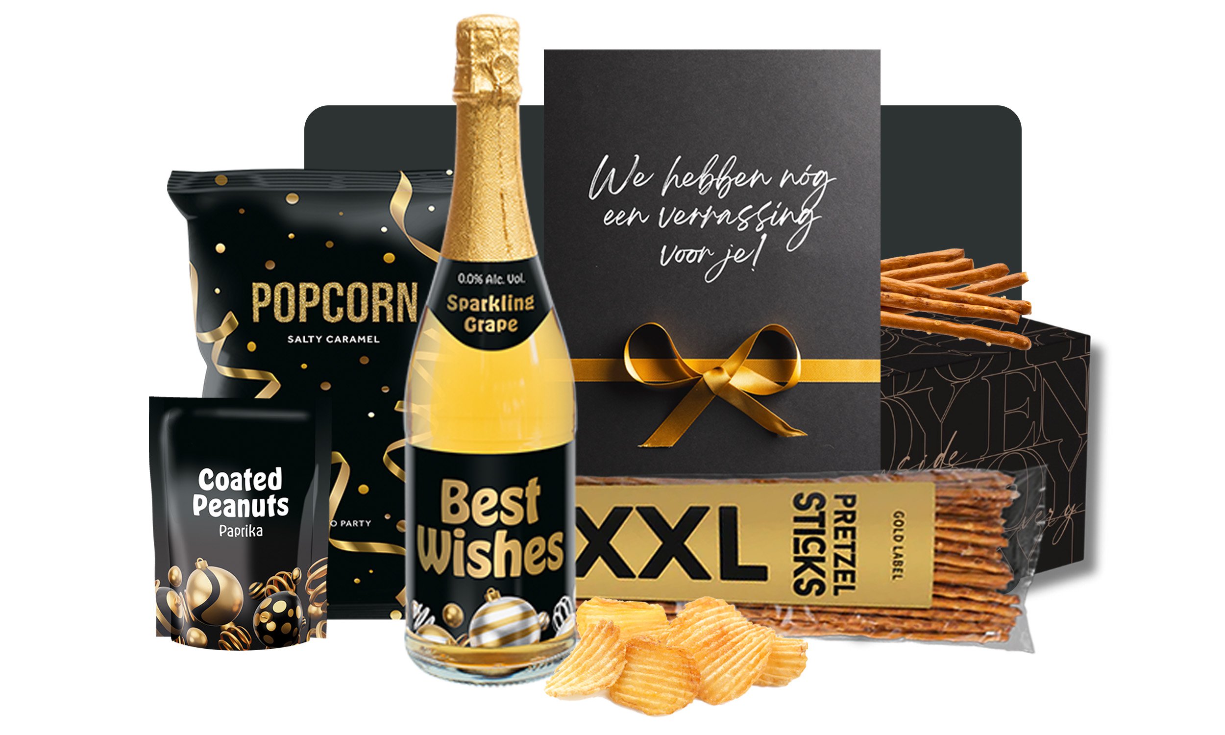 Time to Party Popcorn Karamel, 75 gr Sparkling Grapes 0%, 750 ml Have a Ball Borreln Paprika, 100 gr Pretzel sticks XXL, 225 gr Extra Verrassing, 8 topboeken* Verpakt in een feestelijke kerstdoos
