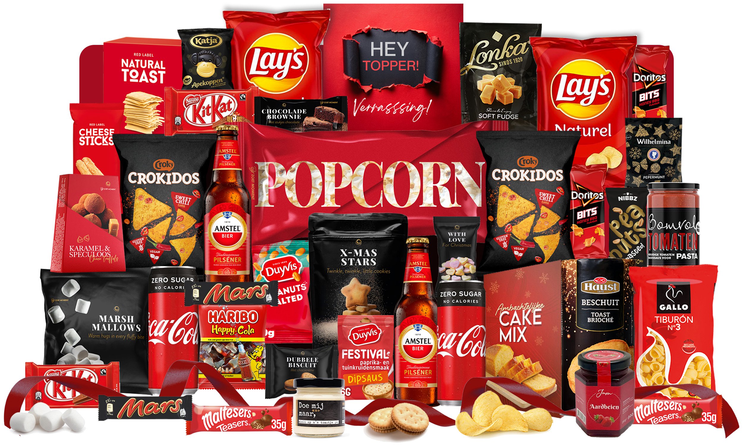 Katja Apekoppen, 65 gr Nibz Pinda’s Gezouten, 50 gr Doritos Bits Honey Bbq, 30 gr, 2 st Mars, 51gr, 2 st Marshmallows, 140 gr Coca Cola Zero, 25 cl, 2 st Maltesers Teaser, 35 gr, 2 st Crokidos Sweet Chili, 150 gr, 2 st Toast, 100 gr Truffels, 50 gr Dubbele Biscuit, 50 gr Sterretjeskoek, 85 gr Ailoi, 90 gr Snoephartjes, 40 gr Lonka Fudge Vanille, 117 gr Popcorn Zoet,100 gr Kaasstengels, 71 gr Lay’s Dipsaus Carnaval, 6 gr Pastasaus Tomaat, 290 gr Gallo Schelpjes, 250 gr Duyvis Pinda’s Gezouten, 60 gr Atlanta Cakemix, 400 gr Lay’s Chips Naturel, 100 gr, 2 st KitKat, 41,5 gr, 2 st Amstel Bier 30cl, 2 st Chocolate Brownie, 50 gr Haribo Happy Cola, 75 gr Aardbeienjam, 450 gr Haust Beschuit, 125 gr Wilhelmina Pepermunt, 65 gr Extra Verrassing, 8 topboeken* Verpakt in een feestelijke rode kerstdoos Afmeting: 390x290x300 mm