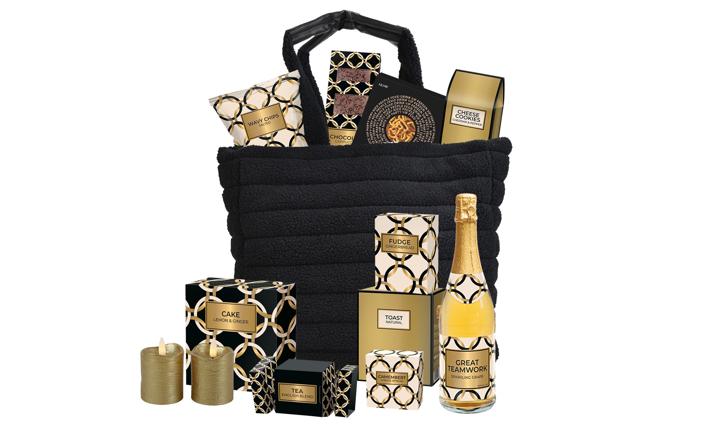 RPET Teddy shopper Ralph Boyer Led kaarsenset goud, 2 delig Deluxe Sparkling Grape 0,0% alc.750 ml Deluxe Toast naturel duo,100 gr Deluxe Camembert Spread, 125gr Deluxe Fudge Speculaas, 110 gr Deluxe Zw. Thee in kadoverpakking, 27 gr Deluxe Cake citroen gember, 400 gr Deluxe Ribbelchips zout, 90 gr Deluxe Chocoreep Cappuccino, 80 gr Deluxe Kaaskoekjes Cheddar peper, 57,5 gr Glow Cheers pretzels, 100 gr Verpakt in een feestelijke kerstdoos