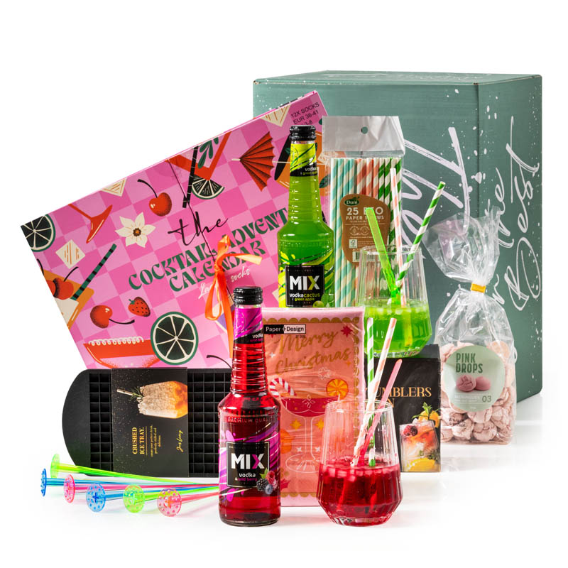 Laat je verrassen door dit originele kerstpakket met een knipoog. De Cocktail Advent Calendar met 12 paar damessokken (maat 3641) zorgt elke dag voor een vrolijke twist, terwijl de stijlvolle tumblers en ijsblokjesvorm de perfecte basis bieden voor zelfgemaakte cocktails. Met de 8-delige cocktailstamper set en kleurrijke bio-rietjes mix je je favoriete drankjes, zoals de frisse Cactus Vodka & Green Apple of de Vodka & Wild Berry. De feestelijke servetten en roze meringue maken het geheel tot een feestje. P.s.: Je hoeft niet te wachten tot de advent hoor, je mag gewoon na ontvangst beginnen met uitpakken. Veel te leuk om dit te laten zitten!