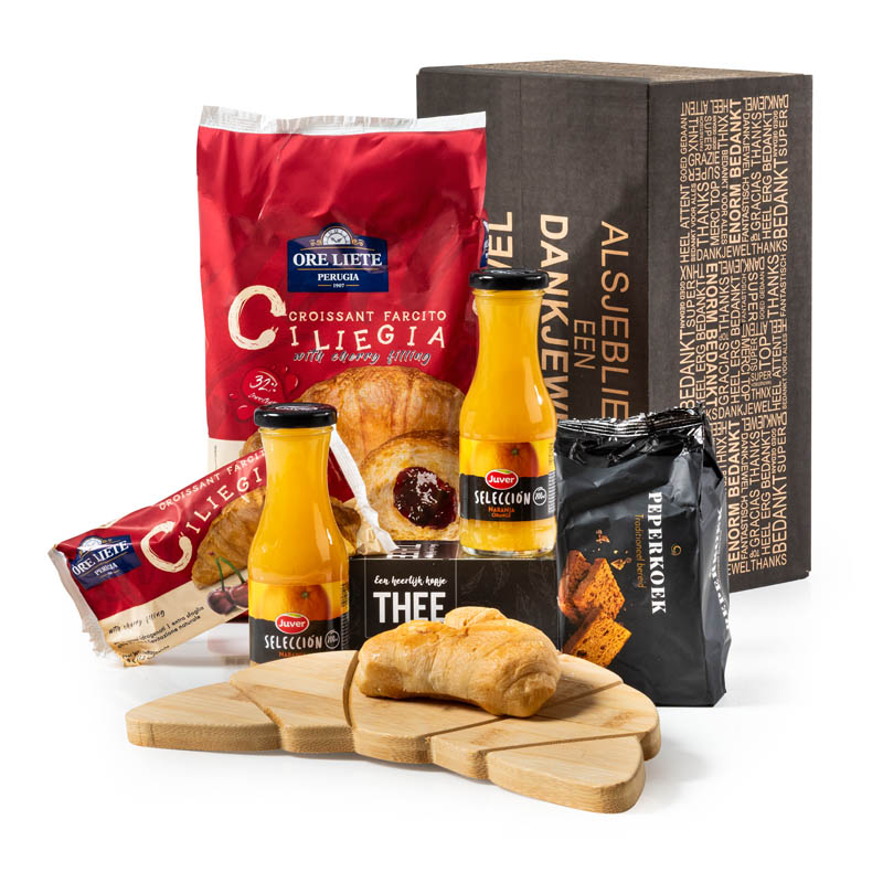 Verras je collegas of relaties met een stijlvol en smaakvol kerst-ontbijtpakket, een heerlijk begin van de dag. Het pakket bevat een luxe houten serveerplank in een croissantvorm perfect voor een sfeervol ontbijt. Geniet van twee verfrissende flesjes Juver sinaasappelsap, een pakje bosvruchtenthee, een smeuïge ontbijtkoek en heerlijke, met kersenjam gevulde croissants van Ore Liete. Alles wordt verpakt in een fraaie geschenkdoos.