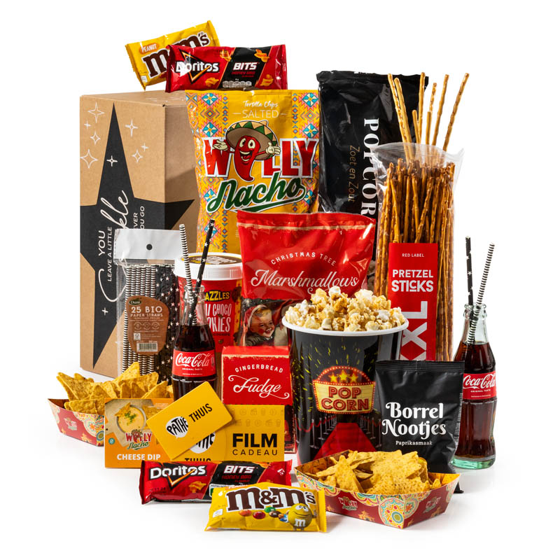 Dit kerstpakket is helemaal in bioscoopstijl en dus perfect voor een gezellige filmavond thuis op de bank. Een geweldig vrolijk en lekker kerstpakket dat de sfeer van de bioscoop naar je woonkamer brengt. Ideaal voor iedereen die van gezelligheid en een filmpje pakken houdt. Samen uitpakken en genieten maar!