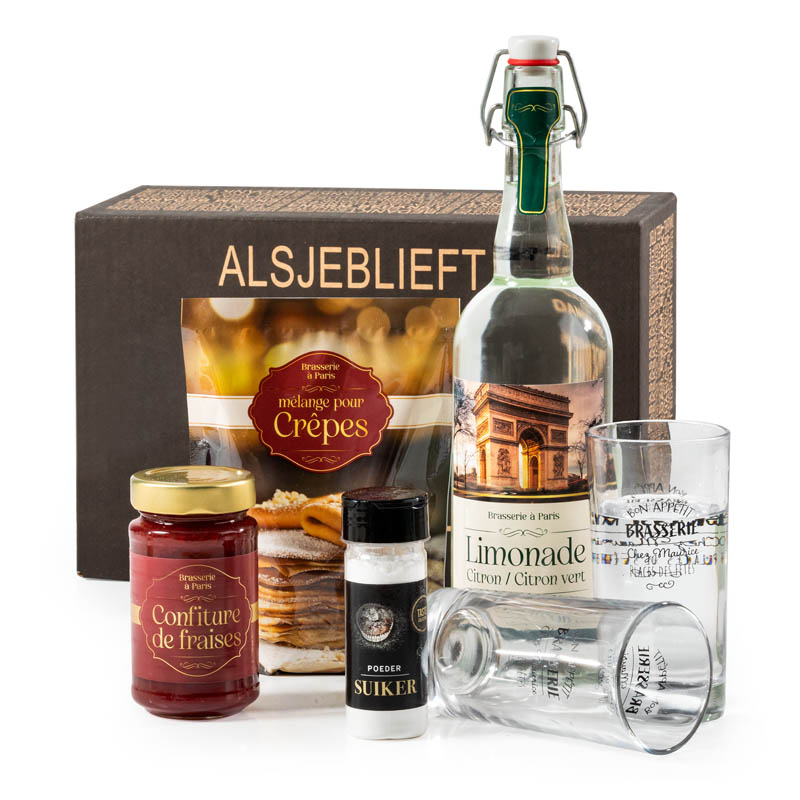 Dit kerstpakket brengt de bekende Franse gezelligheid naar je ontbijttafel. Het bevat o.a. twee “brasserie” drinkglazen en frisse citroenlimonade. Maak in een handomdraai luchtige crêpes met de bijgeleverde mix, serveer met zoete aardbeienjam en een beetje poedersuiker voor dat èchte bistrogevoel. Verpakt in een stijlvolle geschenkdoos.