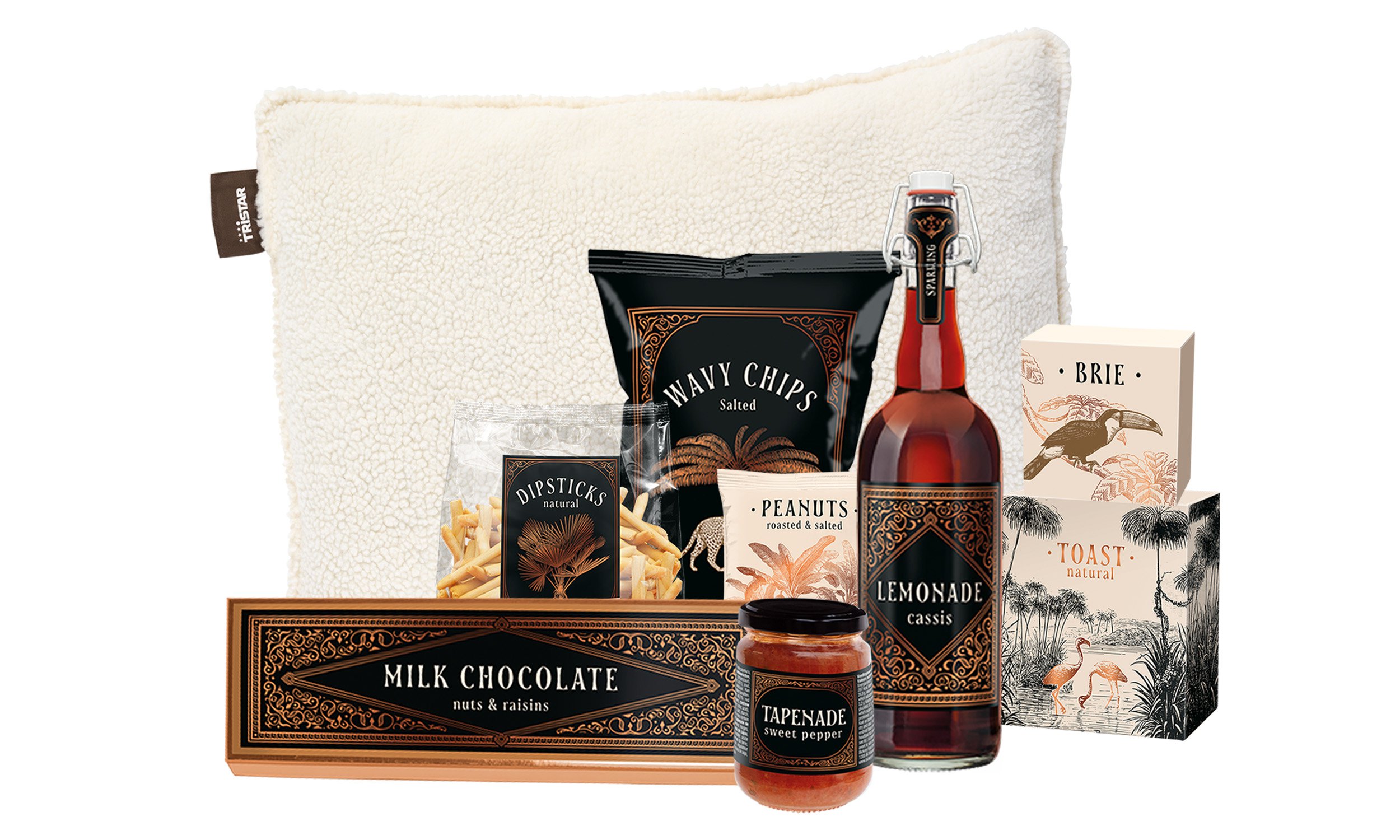 Tristar warmtekussen 60 x 40 xm Nature Paradise Sparkling, 750 ml Nature Paradise tapenade, 130 gr Nature Paradise reep XXL, 225 gr Nature Paradise Toast, 100 gr Nature Paradise Brie, 125 gr Nature Paradise Ribbelchips, 90 gr Nature Paradise Dipsticks, 140 gr Nature Paradise Pinda’s, 100 gr Verpakt in een feestelijke kerstdoos
