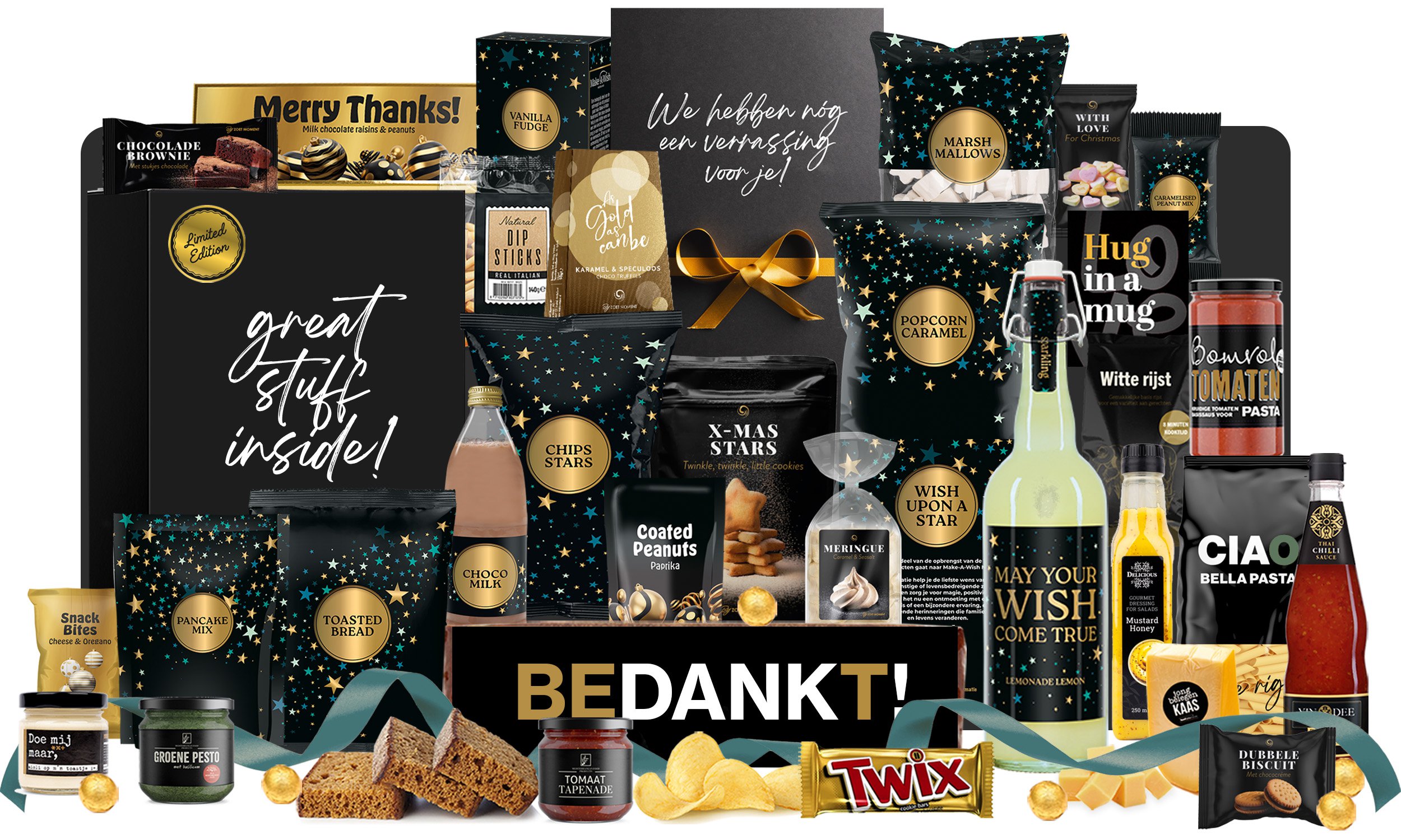 Make a Wish Flyer Pastasaus tomaat, 290 gr Chili saus, 350 ml Honey Mustard Dressing, 250 ml Chan’s Rijst, 400 gr Penne pasta, 500 gr Make a Wish Pannenkoekmix, 180 gr Make a Wish Marshmallow, 150 gr Make a Wish Chocomelk, 500 ml Make a Wish Ster Chips, 75 gr Make a Wish Popcorn Karamel, 75 gr Make a WishSparkling Limonade, 750 ml Ontbijtkoek, 450 gr Chocoladereep XXL, 225 gr Extra Verrassing, 8 topboeken* Verpakt in een feestelijke gouden kerstdoos Afmeting: 390x290x300 mm