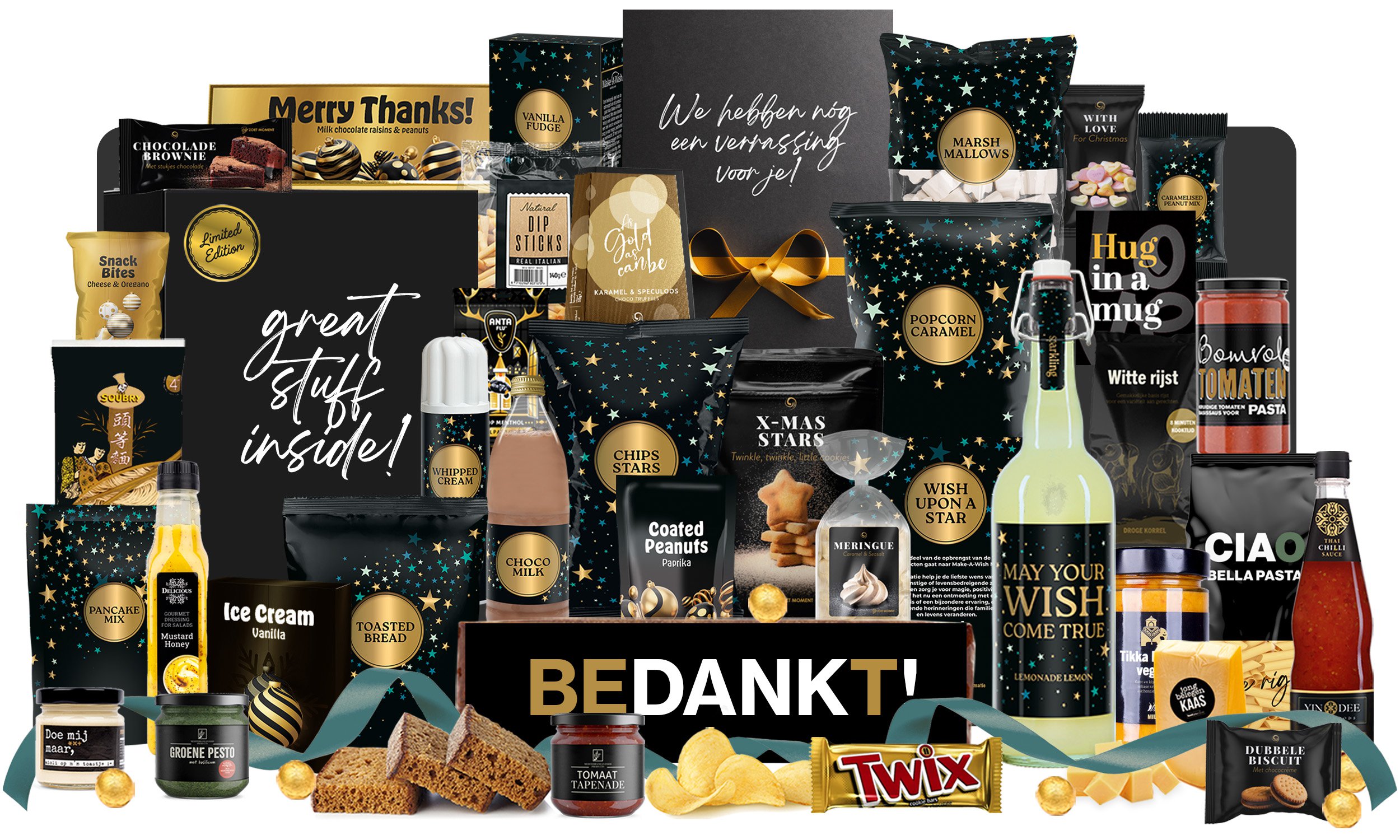 Make a Wish Flyer Pastasaus tomaat, 290 gr Chinese mie, 250g Chili saus, 350 ml Honey Mustard Dressing, 250 ml Chan’s Rijst, 400 gr Penne pasta, 500 gr Curry Massala, 290 gr Make a Wish Slagroom, 250 gr Ijsmix Vanille, 125 gr Make a Wish Pannenkoekmix, 180 gr Anta Flu Kerst Drop, 80 gr Make a Wish Marshmallow, 150 gr Make a Wish Chocomelk, 500 ml Make a Wish Ster Chips, 75 gr Make a Wish Popcorn Karamel, 75 gr Make a WishSparkling Limonade, 750 ml Ontbijtkoek, 450 gr Chocoladereep XXL, 225 gr Extra Verrassing, 8 topboeken* Verpakt in een feestelijke gouden kerstdoos Afmeting: 490x390x200 mm