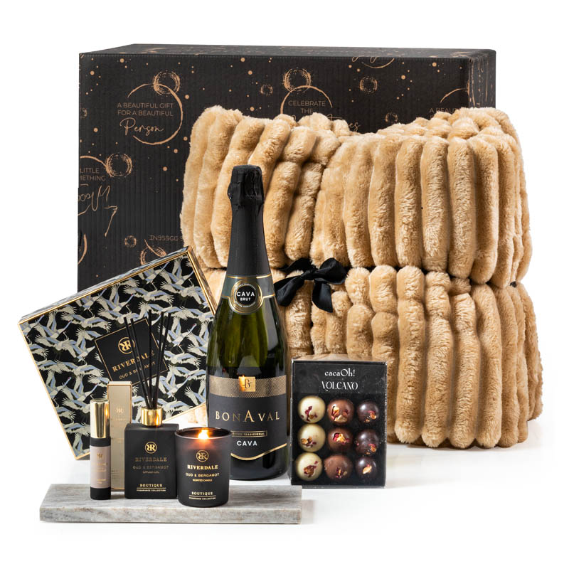 Het warme plaid in zachte beige-tint (150 x 200 cm) biedt niet alleen direct comfort, maar is ook een eyecatcher in het interieur. Combineer dit met het stijlvolle zandkleurige marmeren bord perfect als serveer- of decoratie-item. De luxe Riverdale giftset Olivia met de geur Oud/Bergamot voegt een subtiele geurbeleving toe aan de woonkamer of badkamer. Schenk een glas verfijnde Bonaval Cava Brut in en geniet van een luxe bonbons voor een rustig moment vol smaak en stijl.