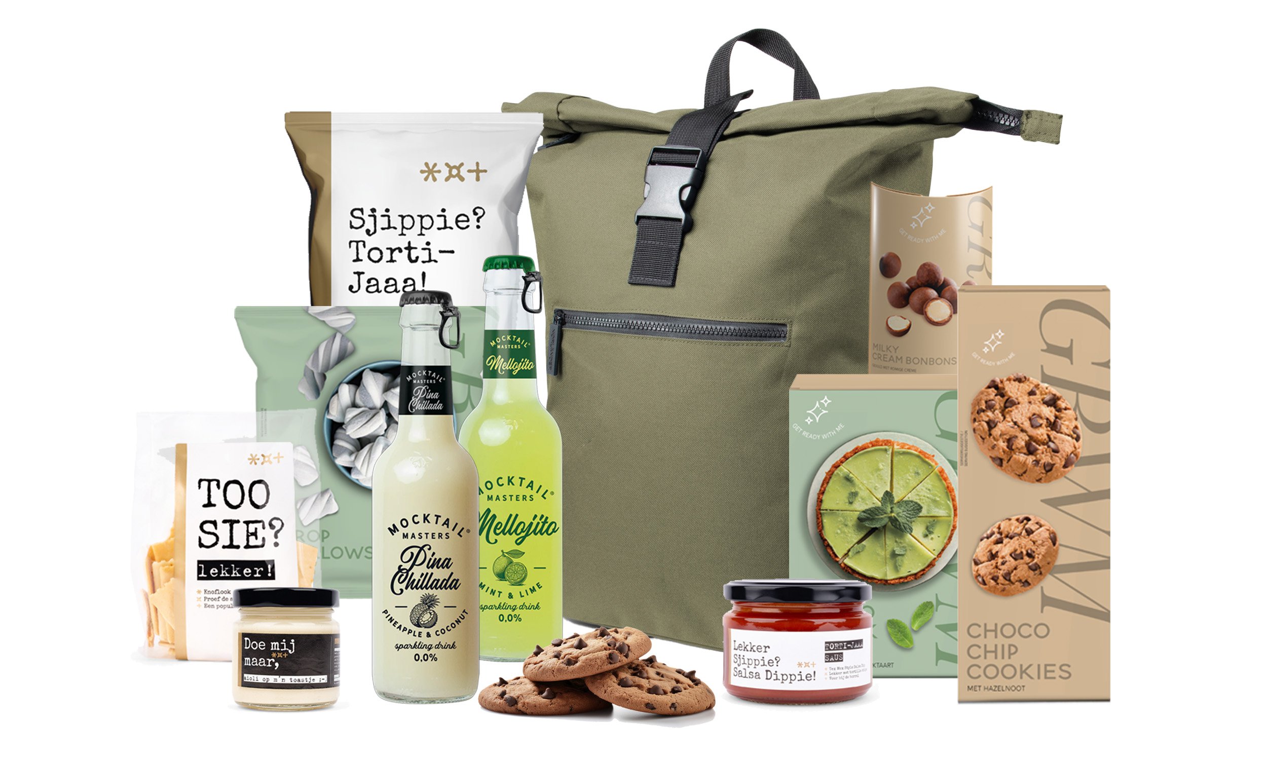 Norlander S.G. Rol Rugtas RPET Mocktail Pina Colada 0,0% alc. 275 ml Mocktail Melloji 0,0% alc. 275 ml GRWM Chocolate hazelnut cookie, 135 gr GRWM Dropmallows, 150 gr GRWM Mojito kwarktaart, 165 gr GRWM Milky cream bonbons mini, 66 gr Torti-Jaaa Sjippie, 150 gr Toosie Knoflook, 150gr Lekker Sjippie Salsa Dippie, 282 ml Doe mij maar aioli op m’n, 90 gr Verpakt in een feestelijke kerstdoos