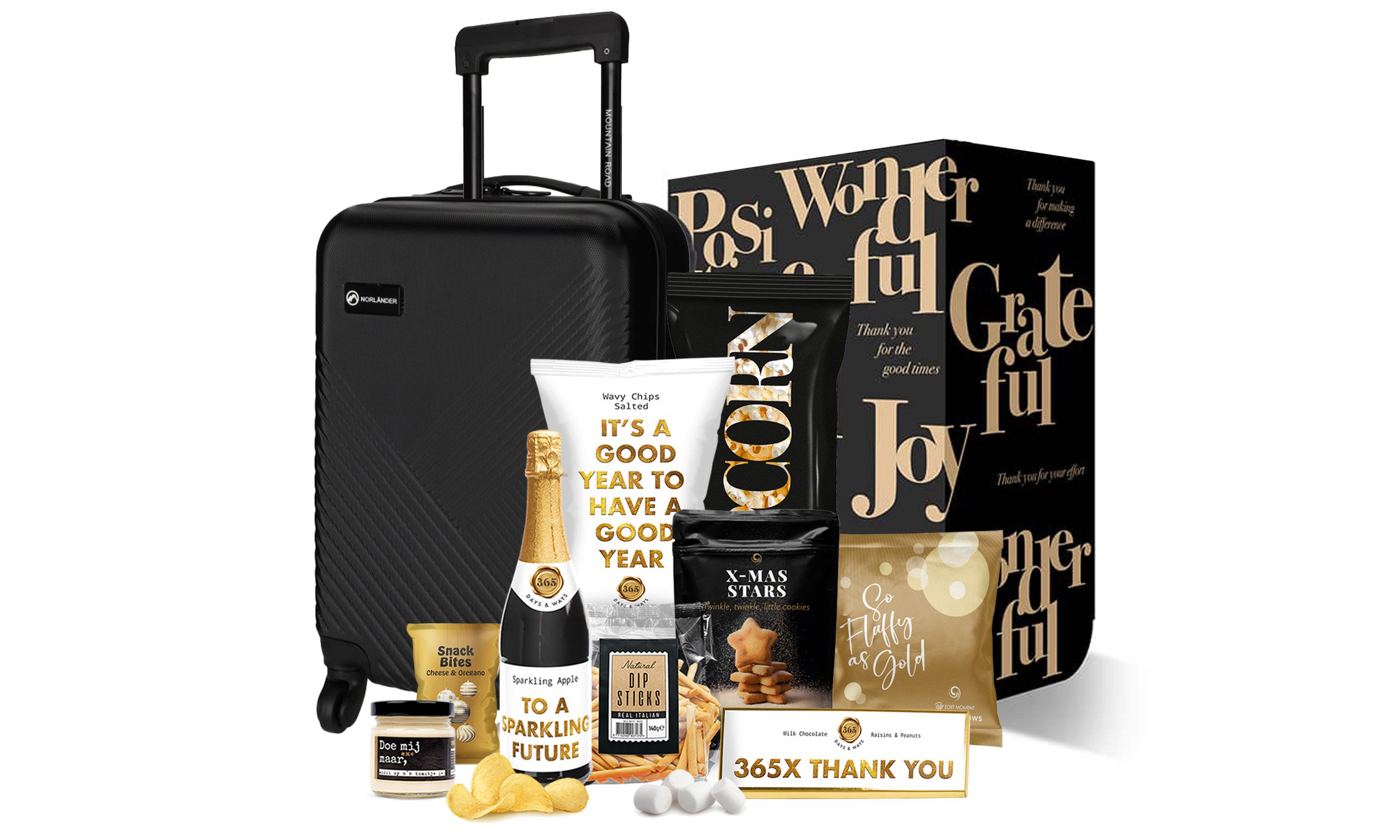 Norlander Mountain Road Trolley 365 Days Sparkling Apple 0,0% alc, 750 ml Marshmallows goud, 140 gr 365 Days Chocoreep XXL, 225 gr 365 Days Ribbelchips zout, 90 gr Popcorn zoet ,100 gr Sterretjeskoek zakje, 85 gr Doe mij maar aioli op m’n, 90 gr Unbranded Dipsticks, 140 gr Have a Ball Bites Kaas Snack, 80 gr Verpakt in een feestelijke kerstdoos