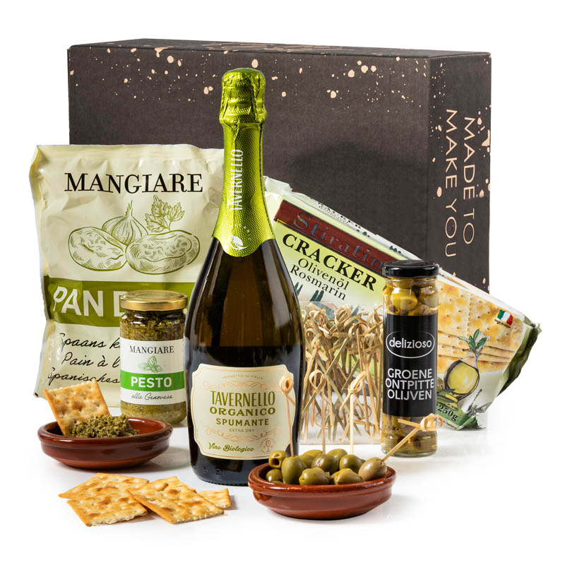 Een prachtig Italiaans geïnspireerd kerstpakket! De smaak van Italië, gewoon bij jou thuis? Dat kan met dit mooie kerstpakket! Breng de zon van Zuid-Europa naar je eigen huis met dit luxe Italiaanse kerstpakket. Geweldig voor een smakelijke borrel of antipasti-avond, compleet met een mooie Spumante, olijven en nog meer. Een chique cadeau of relatiegeschenk voor degene die het verdient.