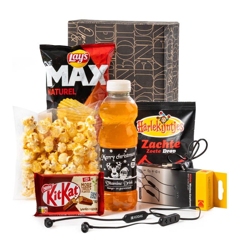 Dit kerstpakket heeft een stoere en smakelijke uitstraling en is ideaal voor wie van snacken en ontspannen houdt. Het bevat een mix van zoete en hartige lekkernijen om van te genieten tijdens het luisteren van jouw favoriete muziek via de draadloze oordopjes.