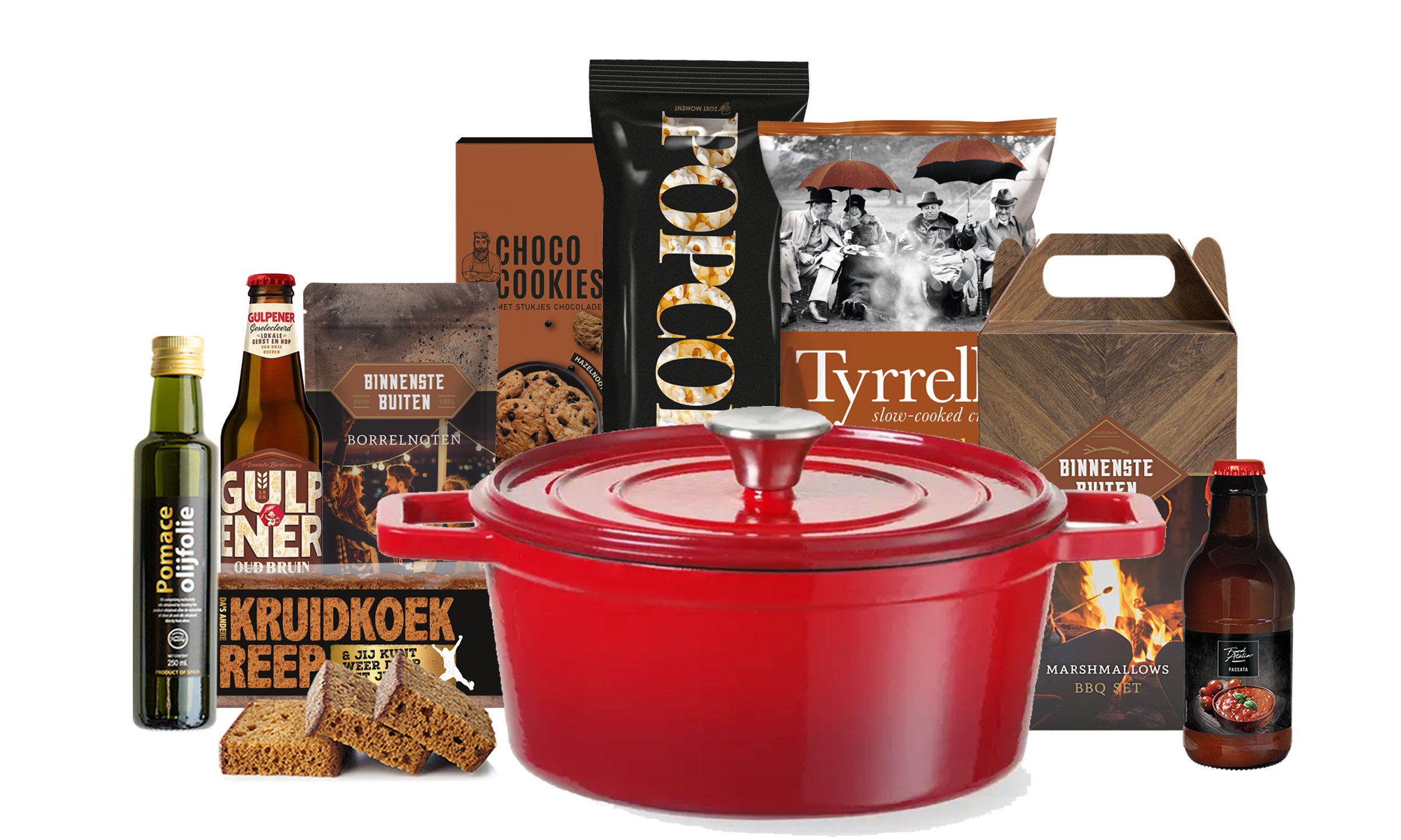 Gietijzeren pan Rood, 24cm Gulpener Oud Bruin, 30 cl Popcorn zoet, 100 gr Tyrrells English smoky barbecue, 150 gr Pomace Olijfolie, 250 ml Food Atelier Passata, 330 gr Binnenstebuiten Borrelnoten, 125 gr Binnenstebuiten Marshmallows, 250 gr Robuust Choc.hazelnut cookie, 135 gr Kruidkoekreep, 110 gr Verpakt in een feestelijke kerstdoos