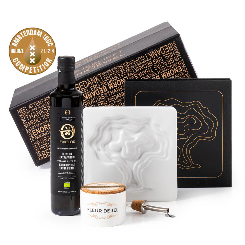 Dit bijzonder fraaie kerstpakket bevat een elegante schaal met boom patroon om (stok)brood te dippen. Een mooie manier om deze olijfolie in te presenteren. De olijfolie kleurt van licht naar donker door de trapsgewijze niveaus. Deze keramieken schaal is 18 cm bij 18 cm en heeft een dikte van 1,5 cm. De schaal is vaatwasser bestendig en heeft een mat witte kleur. De fairtrade olijfolie is van biologische geteelde olijven en is koud geperst, dus extra virgine. De olijven komen uit Tunesië van lokale boeren. De focus: het creëren van voortreffelijke biologische olijfolie die getuigd van hun toewijding en erfgoed. Deze olijfolie heeft wereldwijd diverse awards ontvangen. Uiteraard hoort hierbij mooi grof zeezout in een luxe pot. Een geweldig mooi relatiegeschenk.