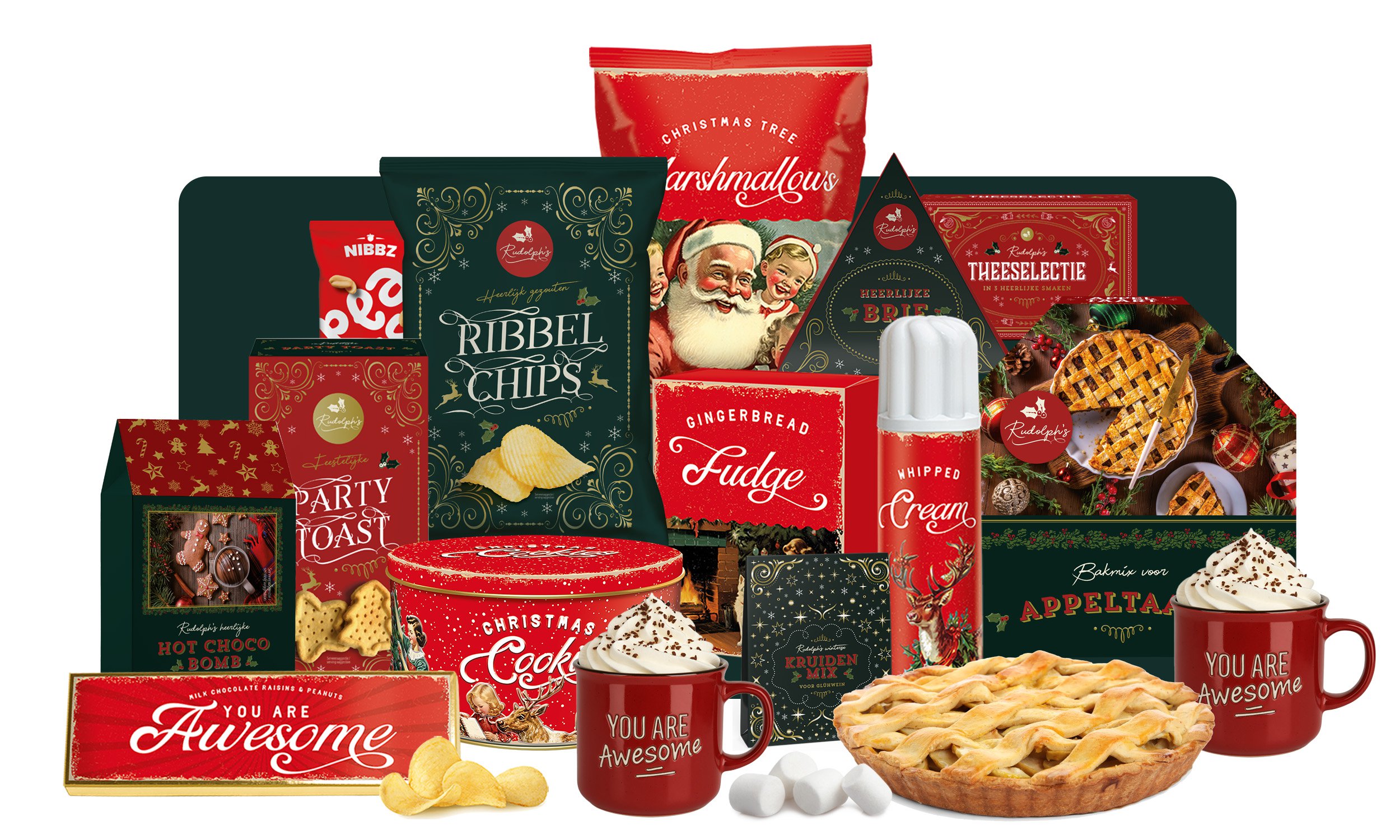 Jens Living Retro Mok, 2 st Rudolph Party toast, 80 gr Rudolph Gluhwein kruiden, 30 gr Rudolph Thee selectie, 3x4x1,5 gr Rudolph Brie, 125 gr Rudolph Appeltaartmix, 300 gr Rudolph Hot marshmallow, 20 gr Rudolph Ribbelchips gezouten, 90 gr Nibbz Pinda’s gezouten red, 50 gr Vintage Gevulde Koektrommel, 150 gr Vintage Marshmallow Boompjes, 125 gr Vintage Fudge Speculaas,110 gr Vintage Chocoreep XXL, 225 gr Vintage Slagroom, 250 gr Verpakt in een feestelijke kerstdoos