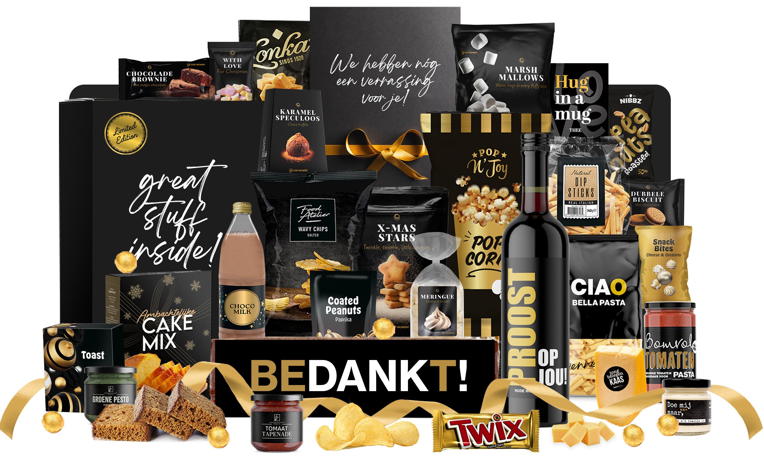Pastasaus Tomaat, 290 gr Chili Saus, 350 ml Chan’s Rijst, 400 gr Penne Pasta, 500 gr Atlant Cakemix, 400 gr Marshmallows, 140 gr Knoflookbroodjes, 150 gr Chocomelk, 500 ml Ribbelchips Gezouten, 90 gr Popcorn, 100 gr Proost op Jou Rood, 750 ml Ontbijtkoek, 450 gr Extra Verrassing, 8 topboeken* Verpakt in een feestelijke zwarte kerstdoos Afmeting: 390x290x300 mm