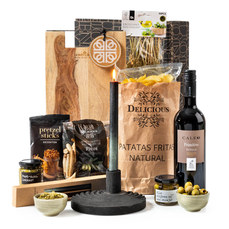 Breng sfeer én smaak samen met dit verfijnde borrelpakket. De zwarte kandelaar in combinatie met de bijpassende zwarte dinerkaars zorgt voor een elegante tafelsetting. Serveer de tapas op de robuuste RoseWood serveerplank met metalen handvat en de groene serveerschaaltjes. Geniet van de Italiaanse rode wijn Caleo Primitivo en combineer dit met zorgvuldig gekozen borrelhapjes: olijven op een stokje, pestospread, patatas fritas, pretzelsticks en picos breadsticks met olijfolie. Een exclusief cadeau voor liefhebbers van smaakvolle eenvoud.