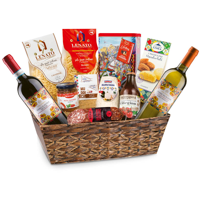 Van ons Italiaanse huis Villa Guelfa is dit een pakket met echte delicatessen van Sicilië. Heerlijke wijnen, twee soorten bronze pasta en de authentieke amandelkoekjes maken deel uit van een fraai opgemaakte luxe, kartonnen geschenk “mand”. De in folie verpakte “mand” wordt geleverd in een fraai gestyleerde geschenkdoos, passend in het Siciliaanse thema. Prachtig om te mogen ontvangen!