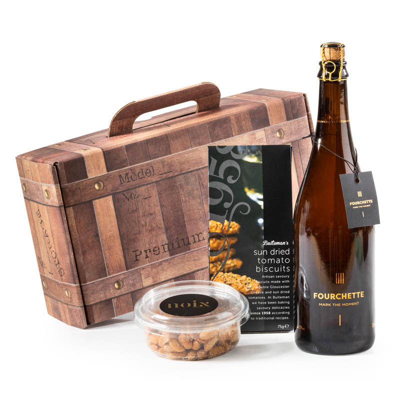 Dit smaakvolle kerstgeschenk zit verpakt in een sfeervolle houtlook koffer. De elegante fles Belgisch speciaal bier Fourchette vormt de perfecte match met hartige Buiteman biscuits met zongedroogde tomaat en de pindas met honing en zout. Een kerstgeschenk dat stijl, smaak en gezelligheid moeiteloos combineert.