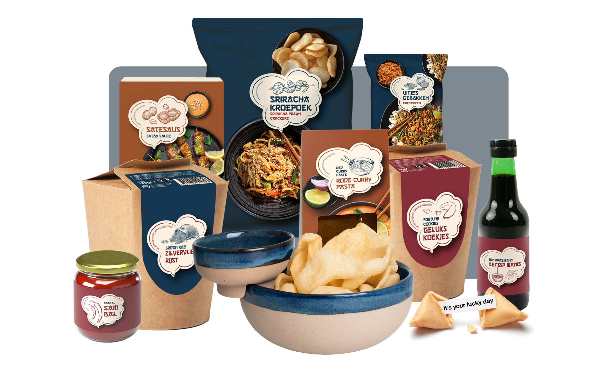 Hugo Kennis serveerset 2-delig Asia Ketjap manis, 250 ml Asia Fortune cookies, 36 gr Asia Red curry pasta, 100 gr Asia Zilvervliesrijst, 200 gr Asia Sambal Badjak, 200 gr Asia Satesaus, 100 gr Asia Sriracha kroepoek, 60 gr Asia Gebakken uitjes, 100 gr Verpakt in een feestelijke kerstdoos