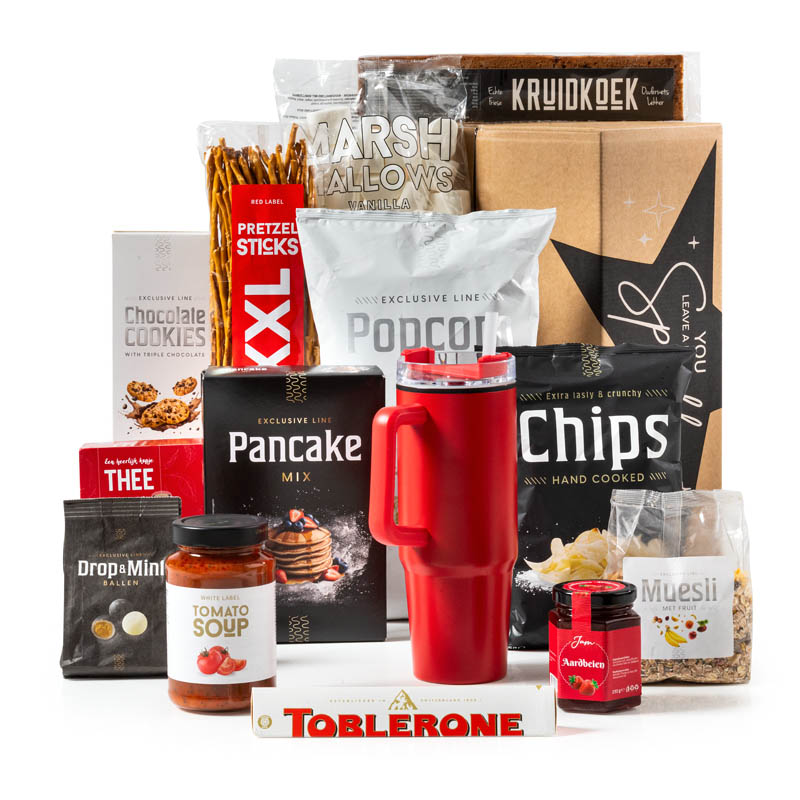 Een rijk gevuld kerstpakket voor elk moment van de dag met als eyecatcher dé thermosbeker die iedereen wel graag wil hebben. Ideaal om mee naar je werk te nemen, voor onderweg en tijdens het sporten! Het kerstpakket bevat veel lekkers voor de hele familie, van ontbijt tot avondmaaltijd, van zoete verwennerij tot hartige borrel: dit pakket biedt een complete en smaakvolle beleving. Ideaal voor medewerkers, klanten of relaties die je écht iets wilt geven.