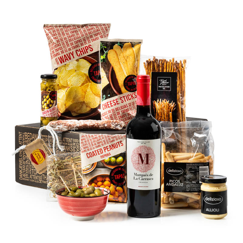 Dit kerstpakket bestaat uit heerlijke producten met een vleugje Spanje erin. Tapas, daar houdt bijna iedereen wel van, even genieten met vrienden of familie van deze lekkernijen. De Spaanse rode wijn, Marqués de La Carrasca is vol, warm en perfect voor bij dit smikkelfeest.