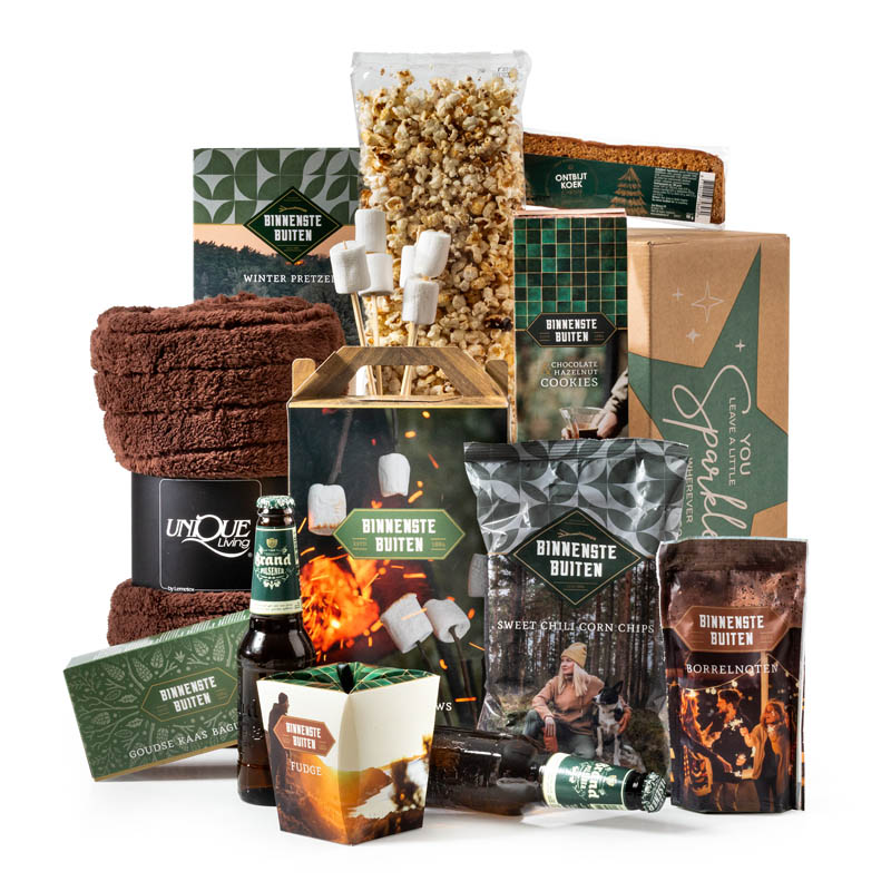 Wat een sfeervol kerstpakket, het ademt gezelligheid uit rond het vuur, met een stoere, natuurlijke uitstraling onder het thema “Binnenste Buiten”. Denk aan borrelhappen, zoete treats, warme smaken en een stevig Brand biertje erbij. Of je nou binnen chillt of buiten een vuurtje stookt: dit is jouw pakket. Compleet met lekker warm plaid is dit wel een echt winters pakket.