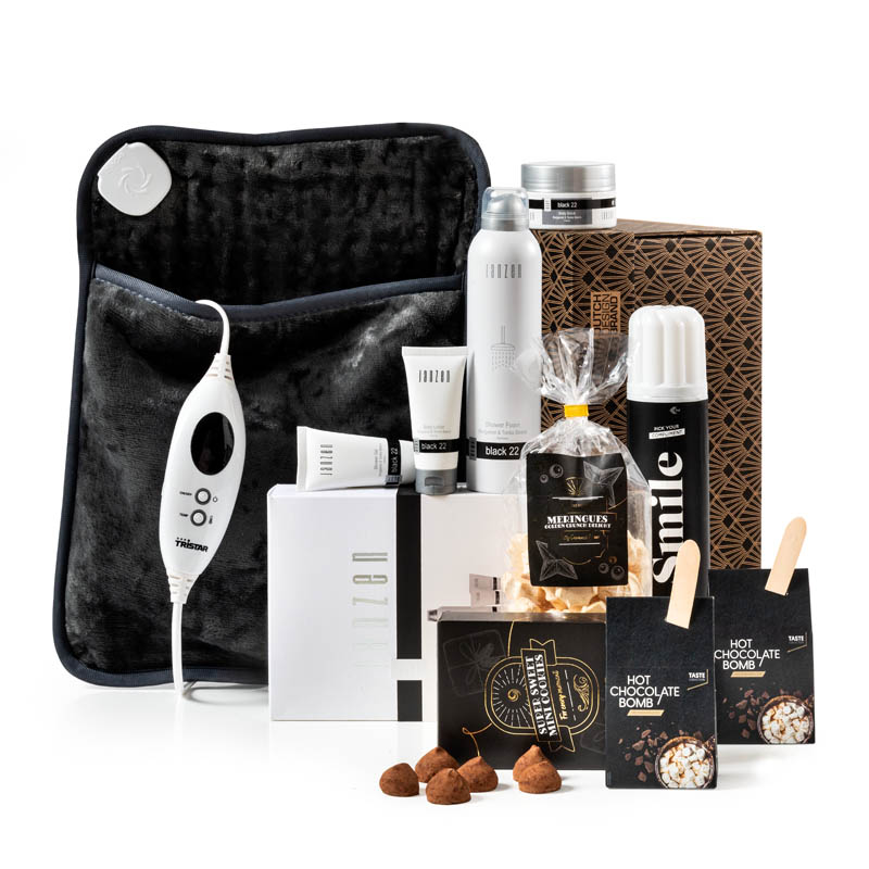 Dit verfijnde winterpakket combineert stijl en comfort in een prachtig geheel. De luxe, in Nederland vervaardigde Dutch Design Art Deco box in ‘Night Sky’-stijl biedt ruimte aan pure verwennerij. Verwarm handen of voeten met de multifunctionele Tristar warmer en geniet van een ontspannend moment. De Janzen Giftset Black 22 voegt een verzorgende touch toe, terwijl de hot chocolate bomb met mini marshmallows, slagroom en fijne koekjes zorgen voor een smaakvol rustmoment. De overheerlijke meringue met salted caramel maakt dit smaakvolle pakket compleet.