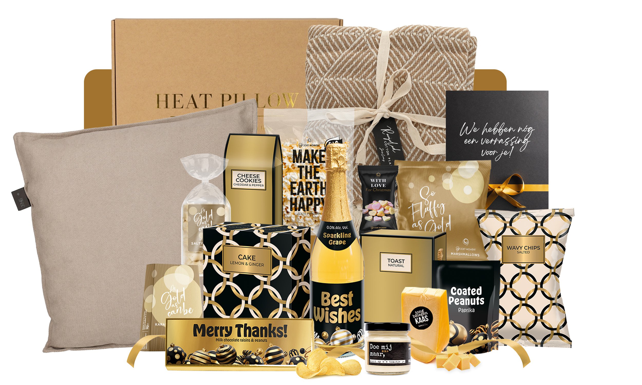 Jens Living Recycled Cotton Plaid 180×30 cm Jens Living Warmetkussen RPET 40×40 cm Deluxe Sparkling Grape 0,0% alc., 750 ml Deluxe Toast naturel duo, 100 gr Deluxe Kaaskoekjes Cheddar peper, 57,5 gr Deluxe Cake citroen gember, 400 gr Deluxe Ribbelchips zout, 90 gr Have a Ball Chocoreep XXL, 225 gr Have a Ball Borrelnoten Parika, 100 gr Jong belegen kaas, 140 gr Snoephartjes Zwart, 40gr Marshmallows goud, 140gr Truffels choco Speciaal, 50 gr Meringue Salty Caramel, 75 gr Doe mij maar aioli op m’n, 90 gr Popcorn Mini BIO, 50gr Extra Verrassing, 8 topboeken* Verpakt in een feestelijke kerstdoos