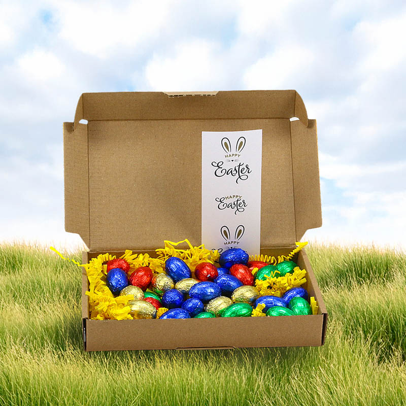 Een paaspresentje met eitjes als leuke weggever! Dit brievenbusdoosje is gevuld met een nestje sizzlepak waarin 30 melkchocolade paaseitjes. Het doosje is gesloten met een “Happy Easter” sluitsticker. Besteleenheid: 12 stuks. Gewicht: ± 260 gram.