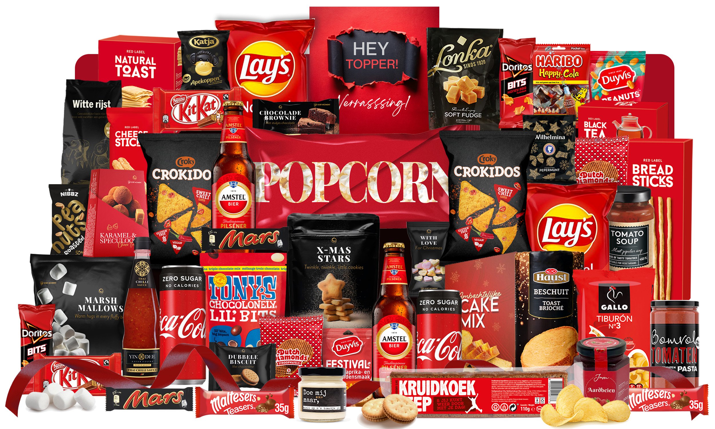 Katja Apekoppen, 65 gr Nibz Pinda’s Gezouten, 50 gr Doritos Bits Honey Bbq, 30 gr, 2 st Mars, 51gr, 2 st Marshmallows, 140 gr Coca Cola Zero, 25 cl, 2 st Maltesers Teaser, 35 gr, 2 st Crokidos Sweet Chili, 150 gr, 2 st Toast, 100 gr Truffels, 50 gr Dubbele Biscuit, 50 gr Sterretjeskoek, 85 gr Ailoi, 90 gr Snoephartjes, 40 gr Lonka Fudge Vanille, 117 gr Popcorn Zoet,100 gr Kaasstengels, 71 gr Lay’s Dipsaus Carnaval, 6 gr Pastasaus tomaat, 290 gr Gallo Schelpjes, 250 gr Duyvis Pinda’s Gezouten, 60 gr Atlanta Cakemix, 400 gr Lay’s Chips Naturel, 100 gr, 2 st KitKat, 41,5 gr, 2 st Amstel Bier 30cl, 2 st Chocolate Brownie, 50 gr Haribo Happy Cola, 75 gr Aardbeienjam, 450 gr Haust Beschuit, 125 gr Wilhelmina Pepermunt, 65 gr Stroopwafel duopack, 64 gr, 2 st Chili Saus, 350 ml Witte Rijst, 250 gr Zwarte Thee, 30 gr Tomatensoep, 290 gr Soepstengels, 125 gr Tony Lil’ Bits. 120 gr Ontbijtkoek, 110 gr Extra Verrassing, 8 topboeken* Verpakt in een feestelijke rode kerstdoos Afmeting: 490x390x200 mm