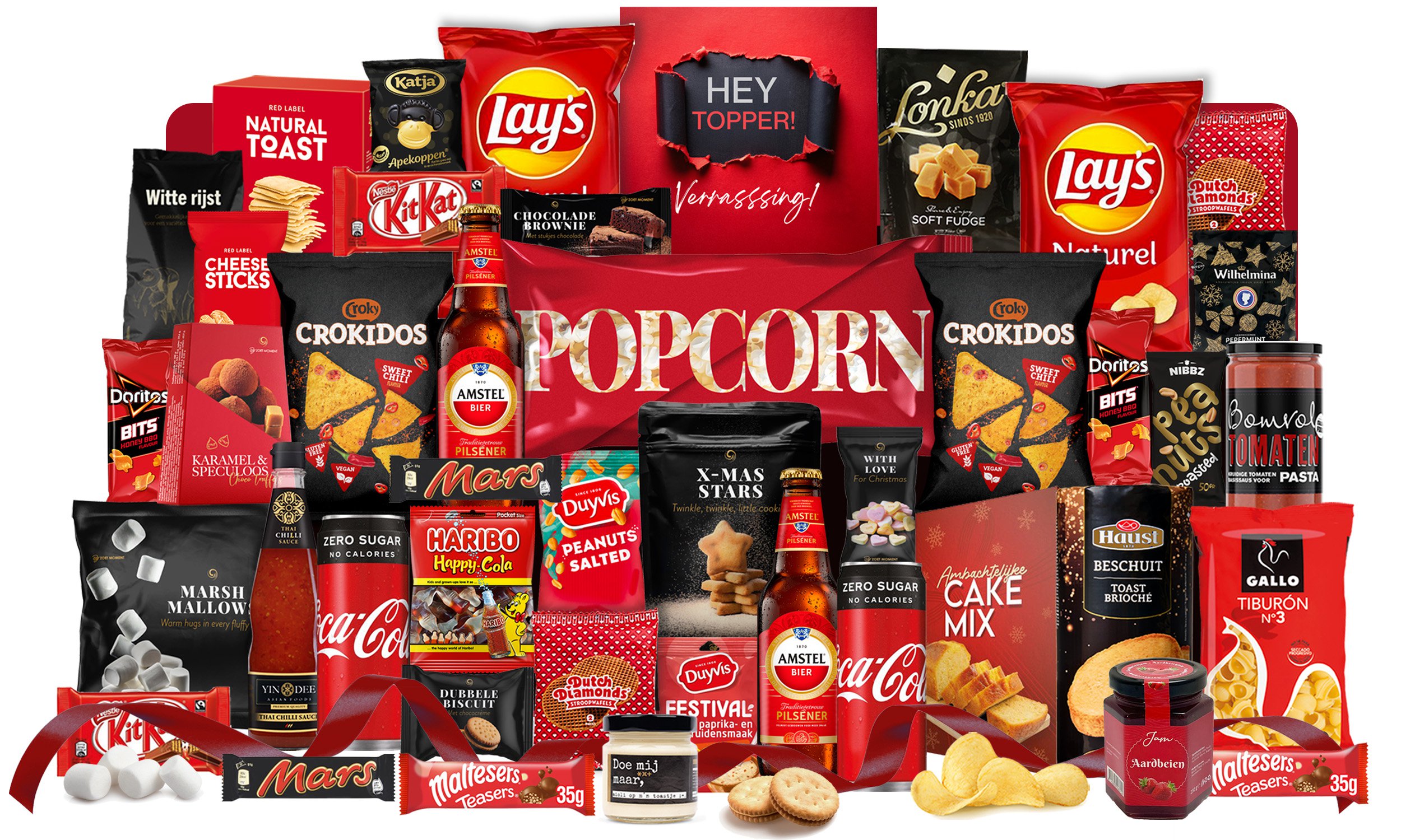 Katja Apekoppen, 65 gr Nibz Pinda’s Gezouten, 50 gr Doritos Bits Honey Bbq, 30 gr, 2 st Mars, 51gr, 2 st Marshmallows, 140 gr Coca Cola Zero, 25 cl, 2 st Maltesers Teaser, 35 gr, 2 st Crokidos Sweet Chili, 150 gr, 2 st Toast, 100 gr Truffels, 50 gr Dubbele Biscuit, 50 gr Sterretjeskoek, 85 gr Ailoi, 90 gr Snoephartjes, 40 gr Lonka Fudge Vanille, 117 gr Popcorn Zoet,100 gr Kaasstengels, 71 gr Lay’s Dipsaus Carnaval, 6 gr Pastasaus tomaat, 290 gr Gallo Schelpjes, 250 gr Duyvis Pinda’s Gezouten, 60 gr Atlanta Cakemix, 400 gr Lay’s Chips Naturel, 100 gr, 2 st KitKat, 41,5 gr, 2 st Amstel Bier 30cl, 2 st Chocolate Brownie, 50 gr Haribo Happy Cola, 75 gr Aardbeienjam, 450 gr Haust Beschuit, 125 gr Wilhelmina Pepermunt, 65 gr Stroopwafel duopack, 64 gr, 2 st Chili Saus, 350 ml Witte Rijst, 250 gr Extra Verrassing, 8 topboeken* Verpakt in een feestelijke rode kerstdoos Afmeting: 390x290x300 mm