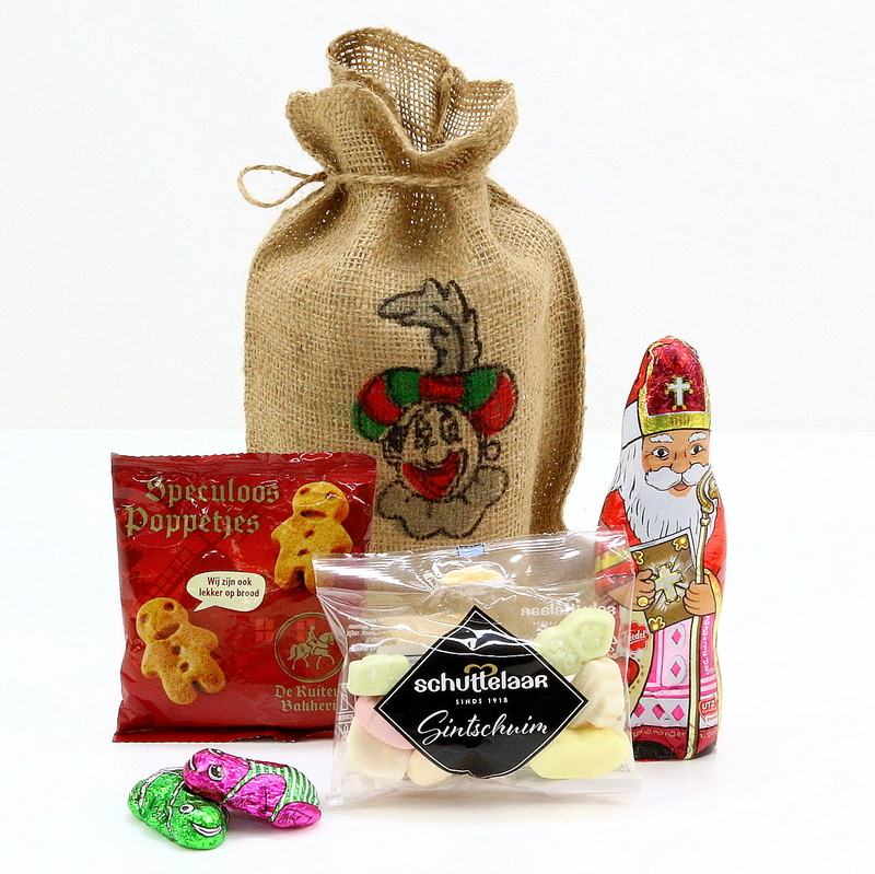 Dit leuke cadeau van Sint en Piet in de jute zak met pietenprint bevat een chocolade Sint figuur, 60gr, een zakje De Ruiter speculaaspoppetjes, 25gr, een zakje Schuttelaar Sint schuimpjes, 50gr en 2 chocolade kikkers of muizen met fondant. Wat een verwennerij! De jute zakken worden met meerdere in een verzenddoos geleverd.