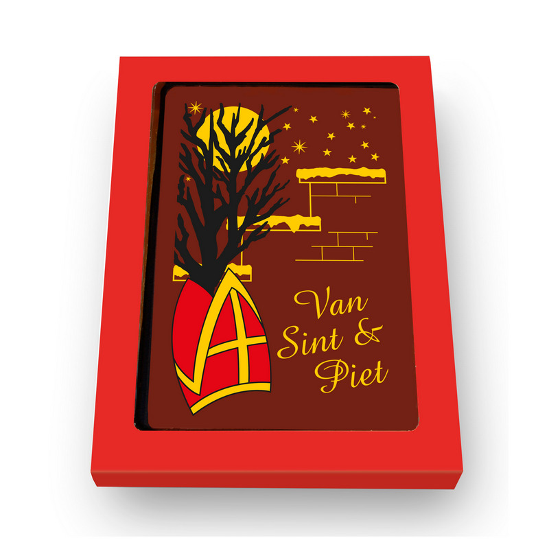 Verras medewerkers, klanten of relaties met deze feestelijke chocolade kaart, 150 gram in Sinterklaassfeer. De kaart is gemaakt van heerlijke melkchocolade en bedrukt met een kleurrijk ontwerp featuring de mijter van Sinterklaas, sterrenhemel en de tekst “Van Sint & Piet”. Verpakt in een luxe rode geschenkdoos is dit een origineel en smaakvol Sinterklaascadeau dat gegarandeerd in de smaak valt.