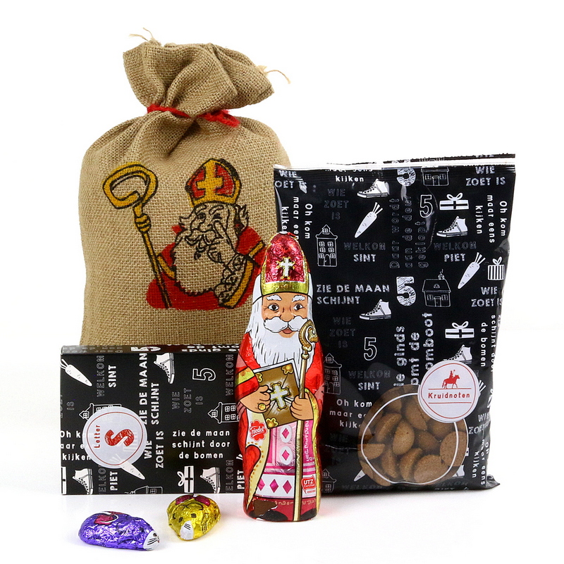 Een jute zak met Sintprint wordt gevuld met diverse lekkernijen. Een grote zak kruidnoten, 200gr, een chocolade Sint figuur, 60gr, een chocolade letter S, 65gr en 2 chocolade kikkers of muizen met fondant. Deze juten zakken worden met meerdere in een verzenddoos geleverd.